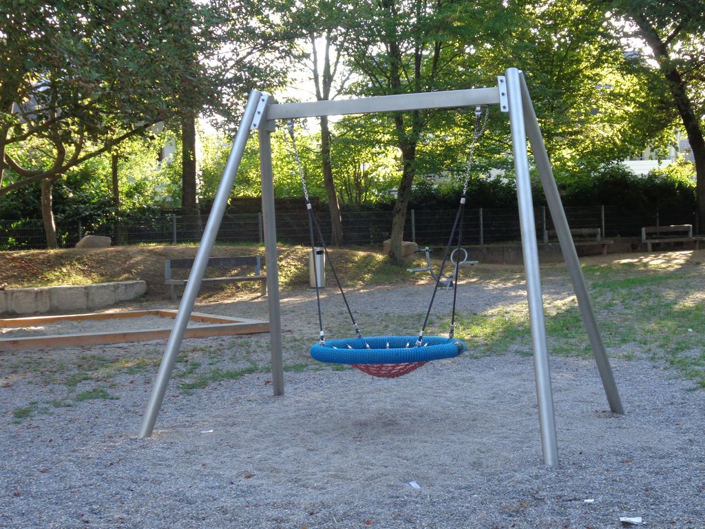 Alter: 6 – 14 JahrenAusstattung: Sitzbänke, Sonne, HalbschattenSpielgeräte: Sandkasten, Vogelnestschaukel, Seilbahn, Turm mit Rutsche, City- Wippe, Tischtennisplatte, Ballspielplatz