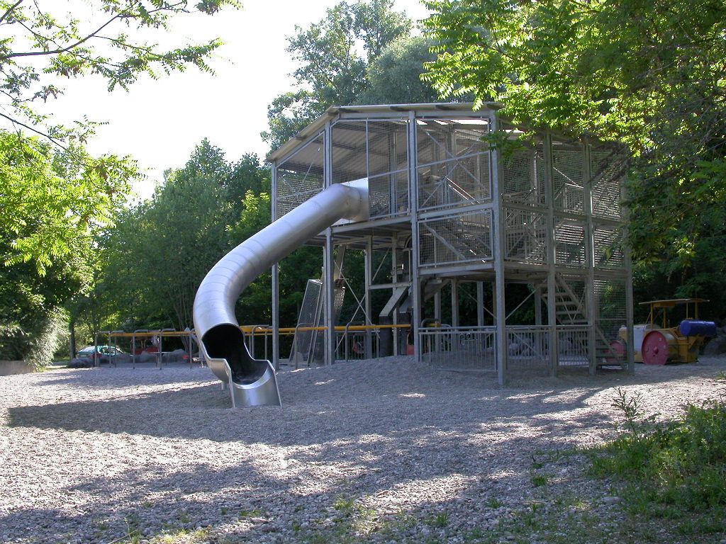 Alter: 3 – 14 JahrenAusstattung: Sitzbänke, Picknick Sitzgruppen, Freifläche zum spielen, Halbschatten, SonneSpielgeräte: Wasserspielbereich, Rutsche, Vogelnestschaukel