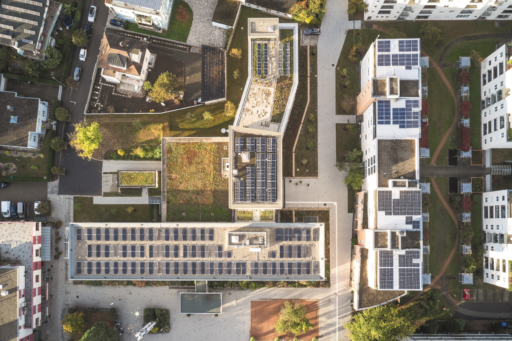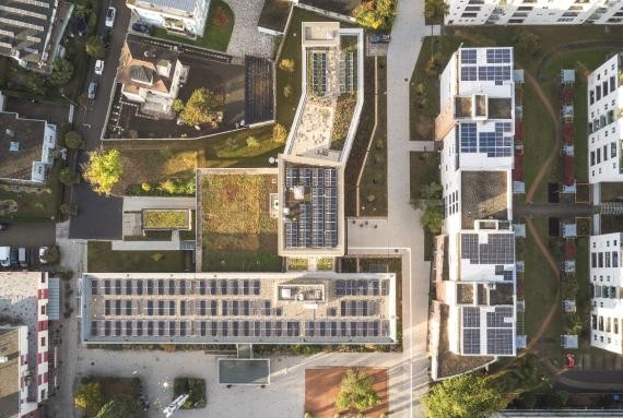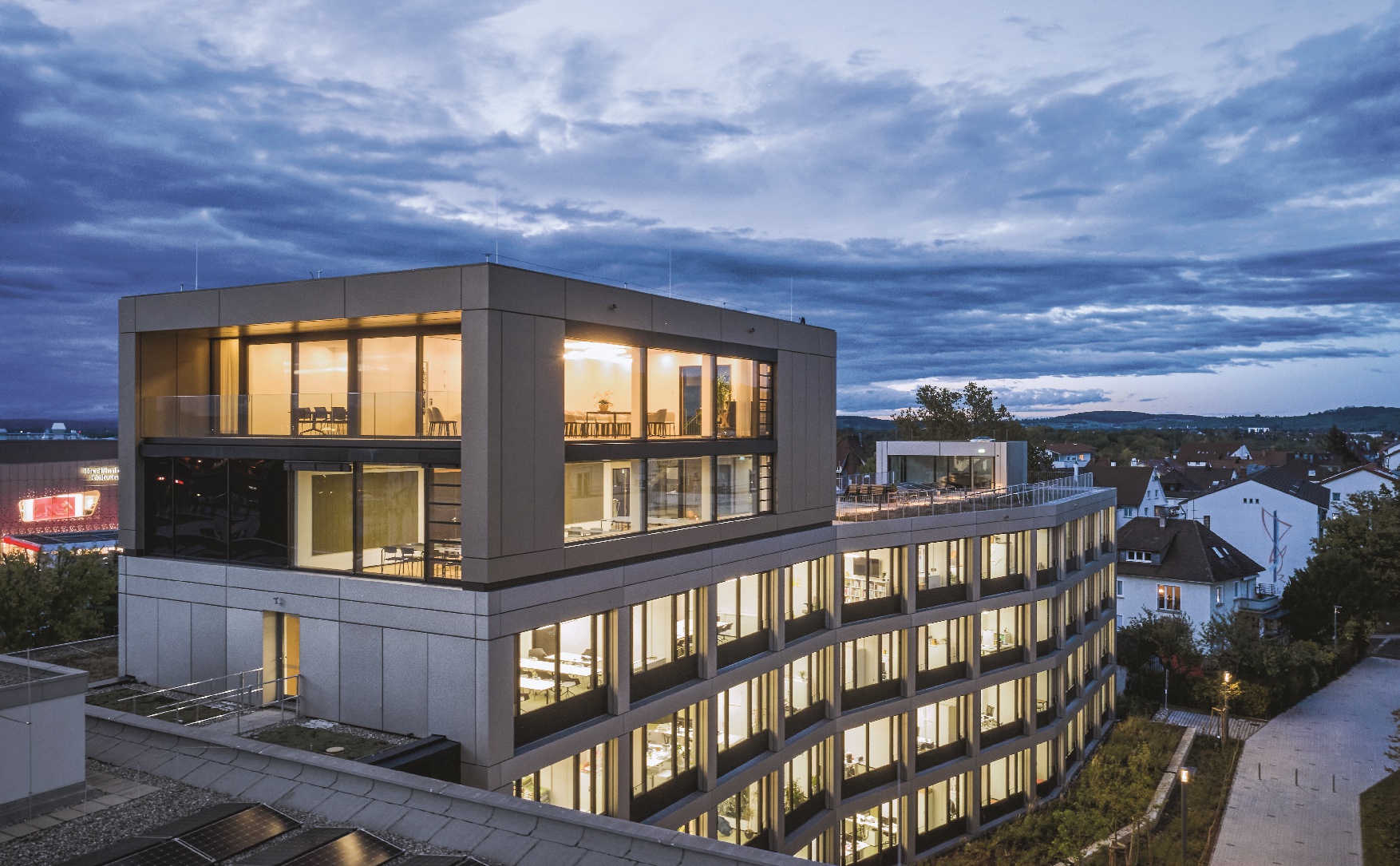 Der Erweiterungsbau mit seinen 69 Büros, drei Besprechungsräumen inklusive Stabsraum für Bevölkerungs- und Katastrophenschutz, einem IT-Schulungsraum sowie einem attraktiven Trauraum ist in seiner Bilanz klimaneutral. Neben einer guten Dämmung gelingt dies durch erneuerbare Energie (drei Photovoltaikanlagen) und rationale Energieerzeugung durch ein Blockheizkraftwerk.