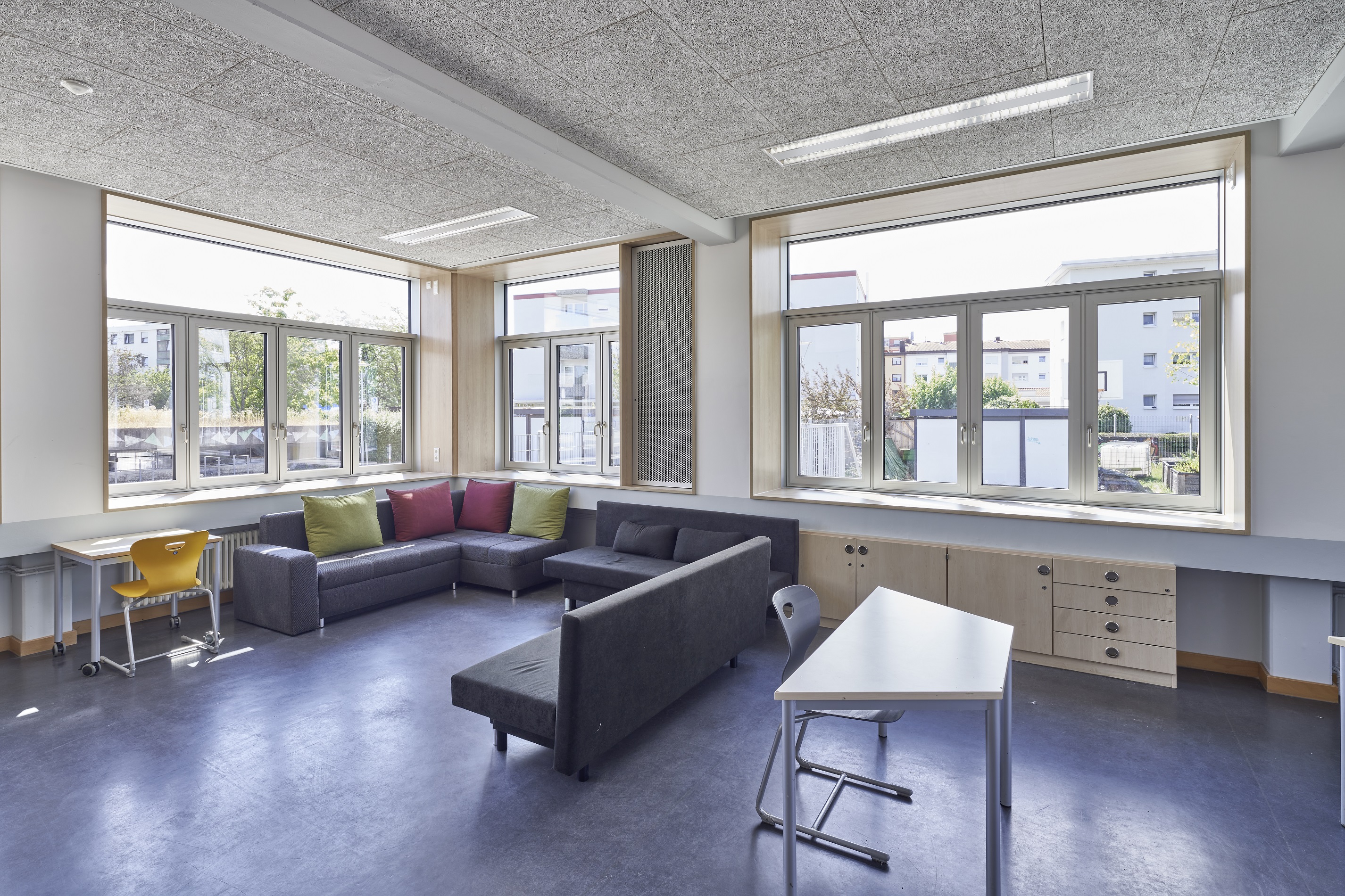 Die Heizung und die Lüftungsgeräte werden über moderne Gebäudeleittechnik überwacht und vom Hausmeister gesteuert. Die auf LED umgestellte Beleuchtung verfügt über eine automatische Abschaltung, bei der ein Bewegungsmelder automatisch das Licht ausschaltet. Im Sommer sorgt ein System außerdem dafür, dass ein nicht benutzter Raum vor Überhitzung geschützt wird, indem die Jalousie automatisch herunter fährt. Die neugestalteten Räume für die Klassen, die Lehrkräfte und das Rektorat wurden innen mit warm wirkenden Holzlaibungen ausgestattet. Die Decken sind mit Holzwolleleichtbauplatten abgehängt und bieten ein hohes Maß an Schallschutz. Neu ist auch der Brandschutz: Neben einer erweiterten Brandmeldeanlage wurden alle Wände und die entscheidenden Türen dem Branschutzkonzept entsprechend hergestellt, beleuchtete Fluchtwegeschilder sowie eine Notbeleuchtung mit Batterieversorgung installiert.