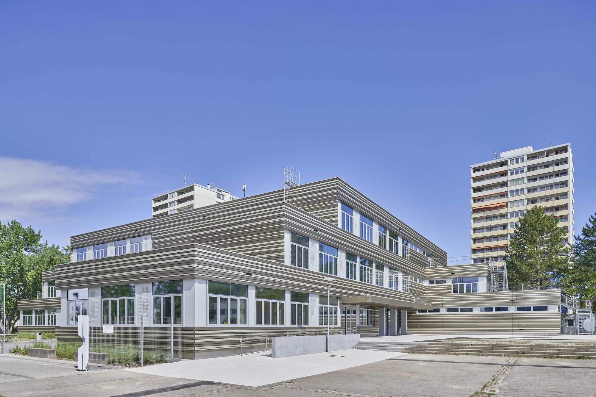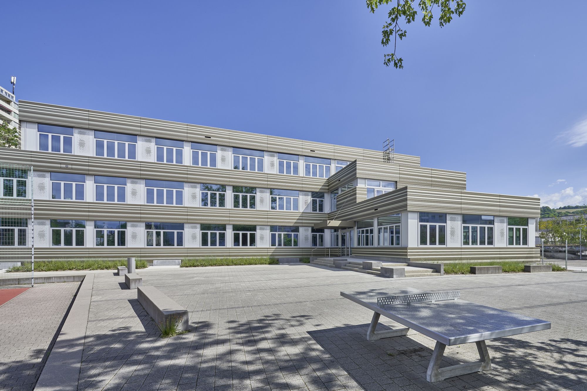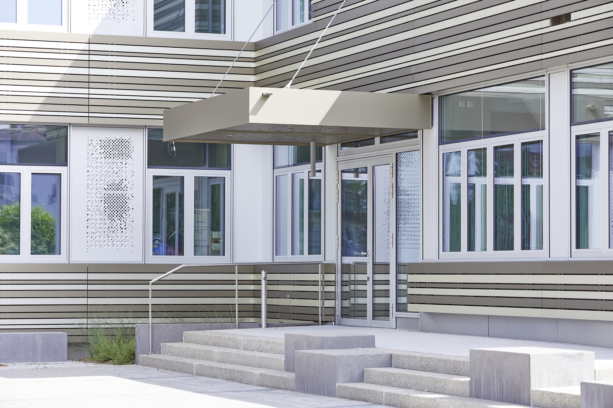 Die energetischen Erneuerungen am Gebäude können sich ebenfalls sehen lassen, denn die ökologischen Vorteile liegen klar auf der Hand: Die jetzt metallverkleidete Fassade des Bauwerks hat eine mineralische Dämmschicht aus 20 Zentimeter starken Steinwolleplatten erhalten, so dass eine äußerst sparsame Beheizung mit maximal drei Litern pro Quadratmeter jährlich möglich ist. Dies entspricht dem sogenannten "KfW-70"-Standard. Die Fensterelemente sind dreifach verglast. Für Wärme und Strom sorgt ein von den Stadtwerken betriebenes Blockheizkraftwerk im Keller der Schule. Die Belüftung der Klassenzimmer mit Wärmerückgewinnung erfolgt automatisch.
