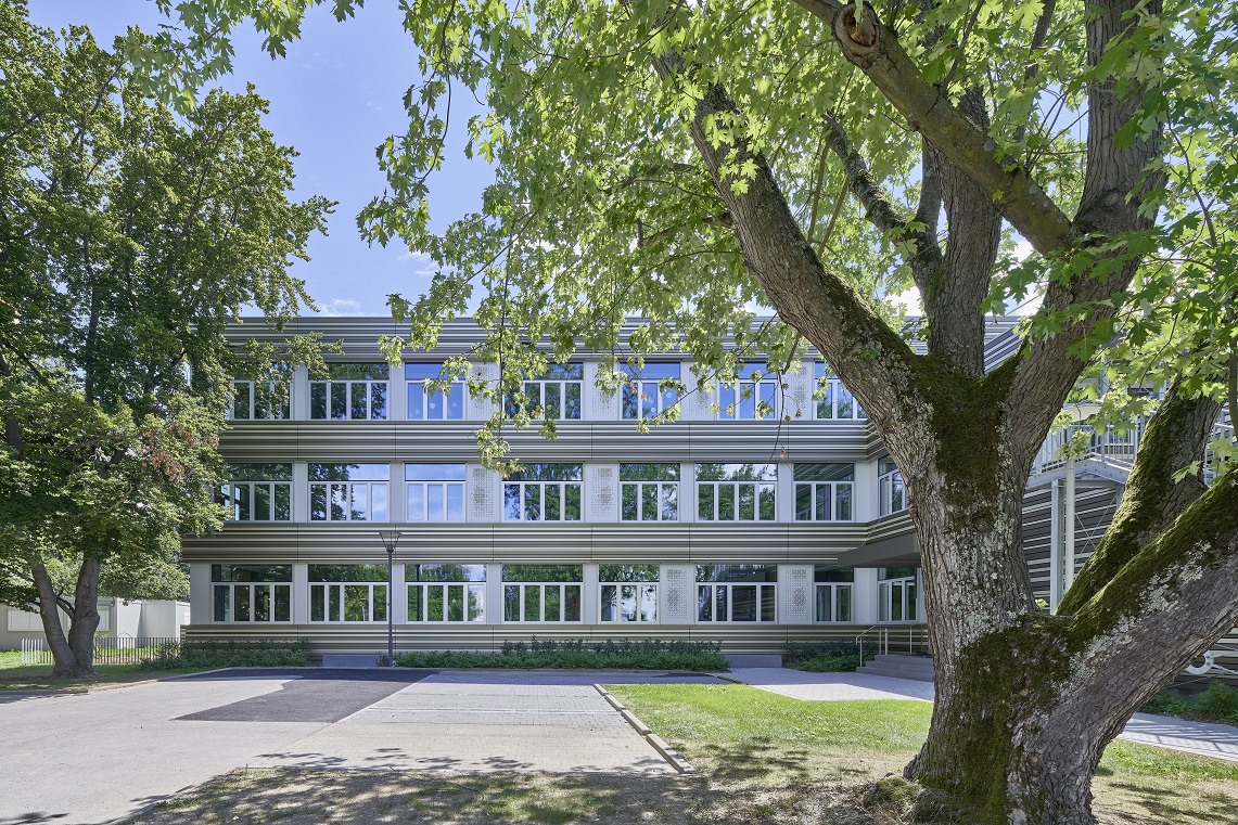 Die Bilanz dieser Sanierung kann sich also sehen lassen. In der Planungsphase des Projekts hatte an einen derartigen Rundumschlag allerdings niemand gedacht. Die 2016 in Auftrag gegebene Machbarkeitsstudie für eine energetische Sanierung zeigte die Hauptarbeitsfelder auf: die dringend notwendige Sanierung der Fassade, die lediglich über eine sechs Zentimeter starke Styropor-Dämmung verfügte, einschließlich der undichten Fenster und eines nicht mehr funktionstüchtigen Sonnenschutzes, der im Sommer den Aufenthalt im Gebäude zur Zumutung machte. Neben den energetischen Faktoren war weiteres Ziel ein Lüftungskonzept für eine konstant hohe Raumluftqualität mit Wärmerückgewinnung.