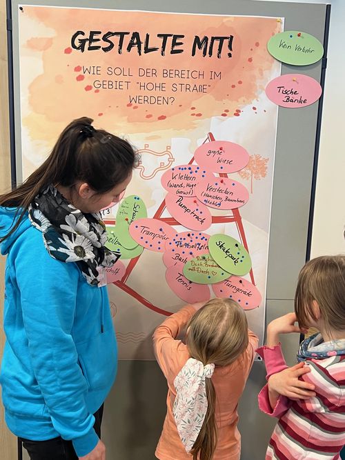 Der Entwurf steht: Die Bürgerbeteiligung zum rund 6.600 Quadratmeter großen Freigelände im Wohngebiet Hohe Straße hat den nächsten Entwicklungsschritt genommen. Die vielen Ideen der Teilnehmerinnen und Teilnehmer haben Landschaftsarchitekt Christian Burkhard und Vera Pham von der Stadt- und Grünplanungsabteilung der Stadtverwaltung aufgegriffen. Ihr Gestaltungsentwurf wurde nun präsentiert.