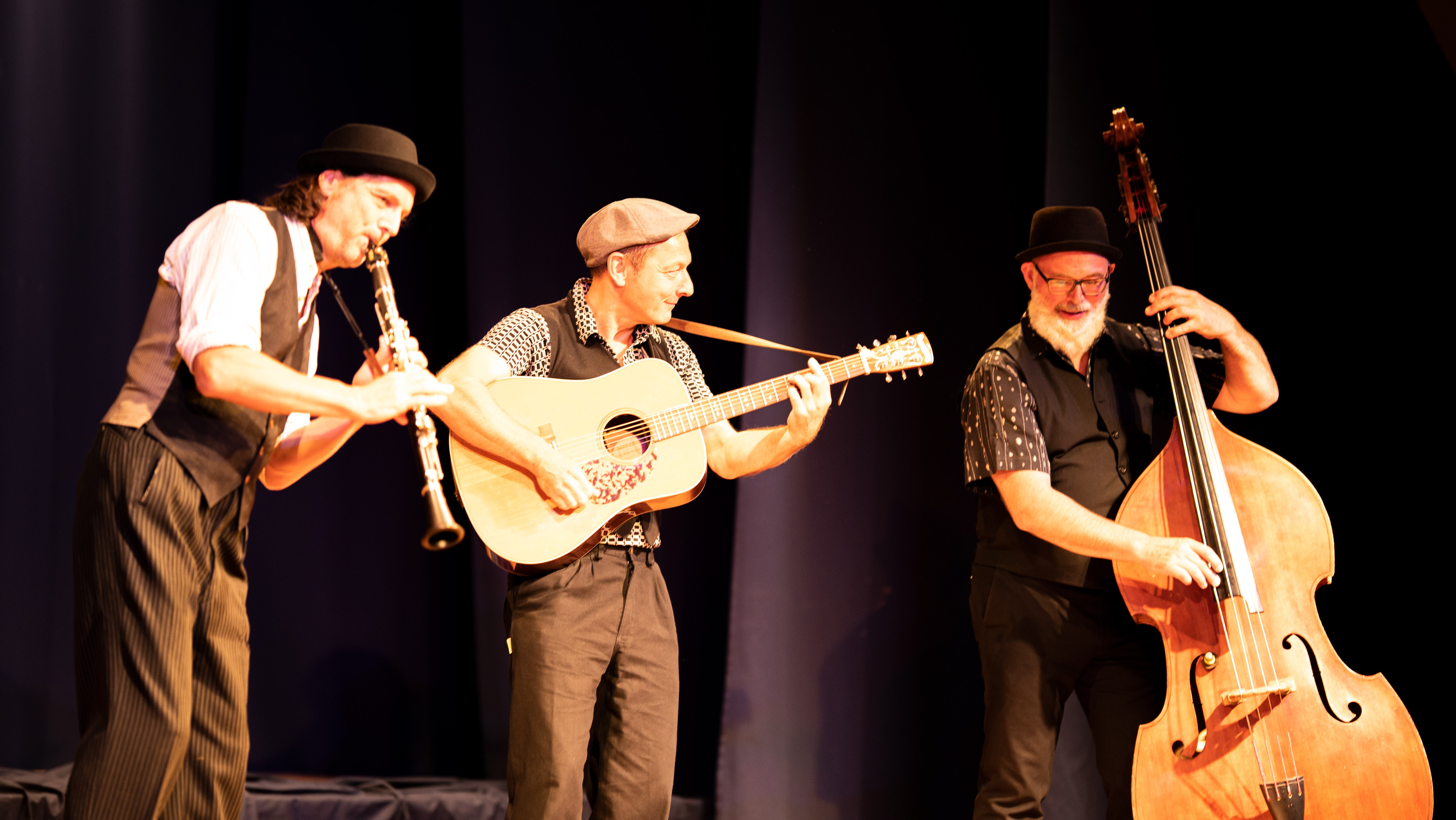 Die drei Freiburger verbinden gekonnt, traditionelle Melodien mit ihren ganz eigenen Arrangements. Robert Dietrich an der Klarinette, Winfried Holzenkamp am Kontrabass und Moise Schmidt mit Gitarre und Gesang bringen fremde und vertraute Musik und Geschichten zu Gehör. In den jiddischen Liedern und Erzählungen, die das Trio vorträgt, schwingt eine zeitlose Liebeserklärung an die Menschen und das Leben mit.