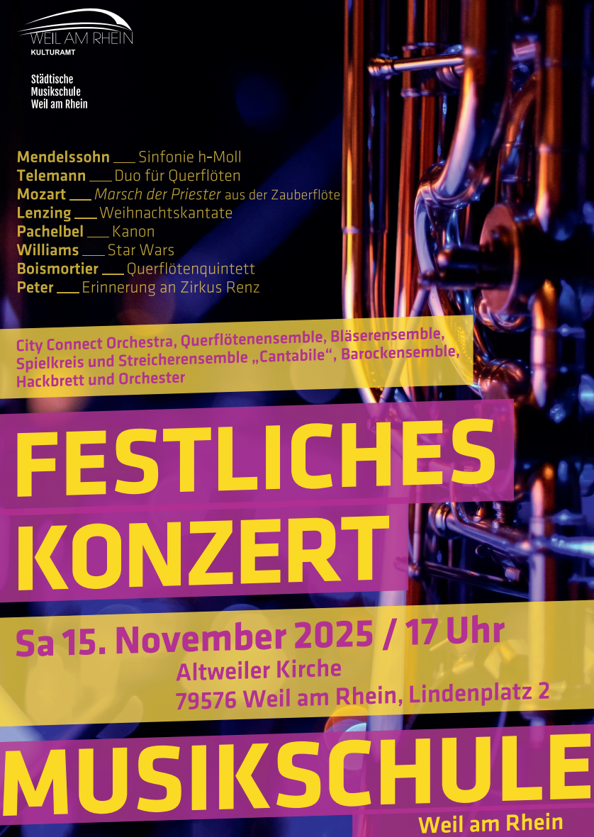 Mitwirkende sind zahlreiche Ensembles der Musikschule – vom Barocktrio über das Querflötenensemble bis hin zum Bläser- und City Connect Orchester. Traditionelle und moderne Klangwelten verbinden sich dabei zu einem festlichen musikalischen Erlebnis, das die Vielfalt und Qualität der musikalischen Ausbildung in Weil am Rhein eindrucksvoll präsentiert.