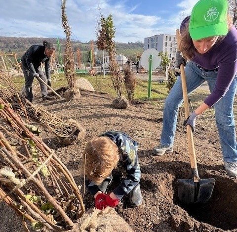 Spieren, wilde Johannisbeeren, Blasensträucher, Weiden und Rosmarinweiden – allesamt robuste und ungiftige Arten fanden auf der rund 6600 Quadratmeter großen Fläche, die künftig als Aktions- und Naturerfahrungsraum dient, ihr neues Plätzchen. Groß und Klein gruben Löcher in die Erde, setzen die Setzlinge ein und gossen diese schließlich unter Anleitung der Mitarbeitenden der Stadtgärtnerei und der Grünplanung fachmännisch an.