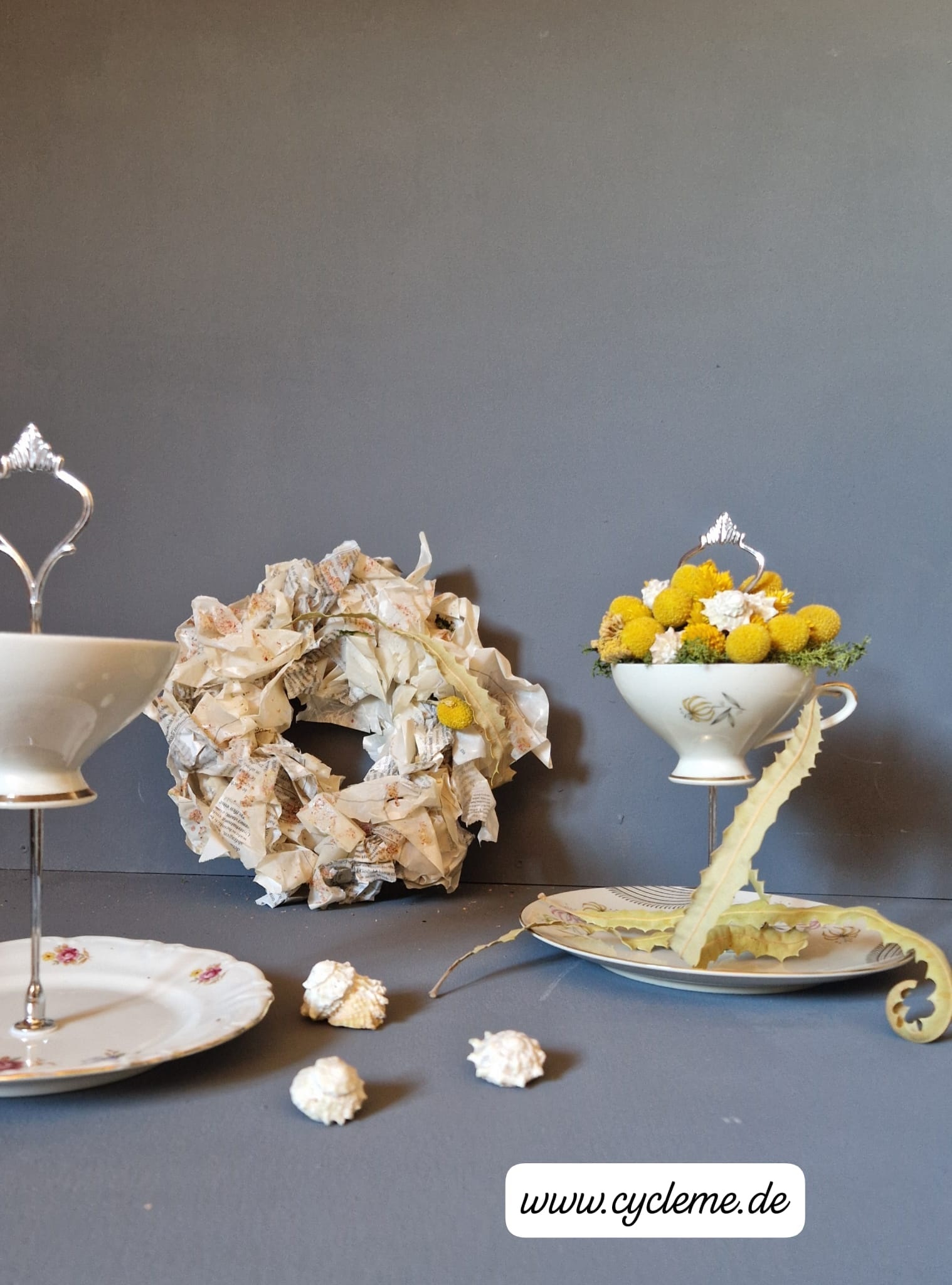 Im Abendseminar „Floras Design und Upcycling“ am 20. Mai von 17:00 Uhr bis 20:00 Uhr wird unter fachkundiger Anleitung der Dozentin eine sommerliche Tischdekoration aus Porzellan und Papier gestaltet. Die Kursteilnehmenden erhalten eine Etagère aus einem nostalgischem Kaffeeservice und diese wird mit sommerlichem Gartengrün, Blüten und einem Papierkranz, welcher eigenhändig hergestellt wird, ausgeschmückt. Das Kunstwerk kann danach mit nach Hause genommen werden.